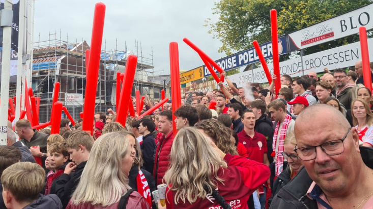 Gezellige stemming in Bunschoten-Spakenburg met veel blauwe en rooie supporters waaronder ook veel bezoekers van buiten het dorp. Het stadion van Spakenburg was uitverkocht wat betekent dat 8000 enthousiaste voetbalfans hun weg naar dit stadion hadden gevonden. Bij de rooien werd de live-tv uitzending ook gevolgd door aardig wat fans. Opvallend was dat de “drooglegging” die de afgelopen jaren tijdens de derby tot 15.00 uur van kracht was dit jaar door de gemeente niet was ingesteld. Dat gaf een gezellig beeld op de terrassen in het centrum.