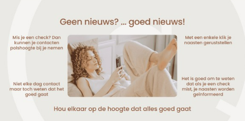 De app richt zich vooral op zelfstandig wonende ouderen, maar is ook geschikt voor andere mensen die alleen leven en hun naasten gerust willen stellen. Gebruikers kunnen meerdere checks en meerdere contactpersonen instellen, afhankelijk van hun persoonlijke situatie. Dankzij Marcel Noorden is er nu een laagdrempelige manier om zowel zelfstandig wonen als geruststelling voor naasten te combineren. Bron: Eemland1.
