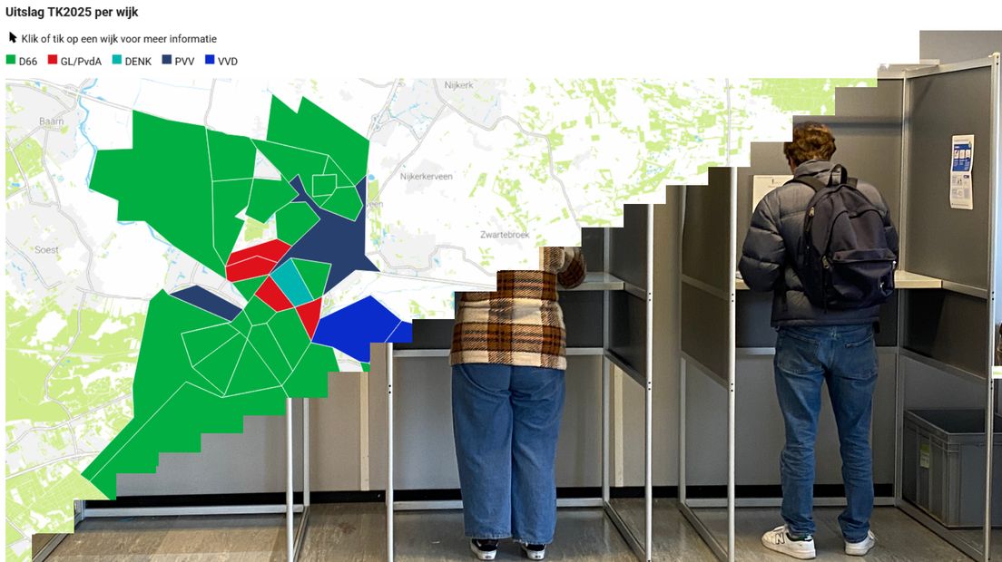 In Leusden worden vijf wijken onderscheiden. In drie wijken was in 2023 de VVD de grootste. GL/PvdA en PVV waren in 1 wijk de grootste. Vorige maand is dit beeld totaal veranderd. D66 werd in drie wijken de grootste. De VVD verloor 1 wijk, maar is in twee wijken nog de grootste. GL/PvdA en PVV zijn in geen enkele wijk meer de grootste.